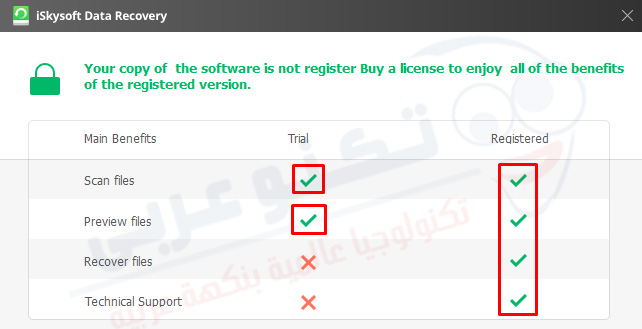 - البرنامج مدفوع ولكن هناك نسخة تجريبية منه تتيح لك فقط البحث عن الملفات المحذوفة واستعراضها، ولإستعادتها بشكل كامل فعليك شراء البرنامج بسعر 29.95$ والحصول على باقي المميزات الإضافية مثل التواص مباشرةً مع الدعم الفني.