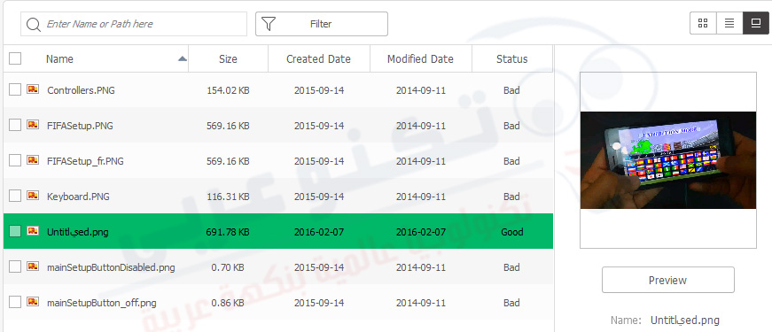 ميزة معاينة الملفات قبل إستعادتها: حيث يعرض لك برنامج iskysoft data recovery شكل الملفات وحالتها قبل إسترجاعها لأنه قد يكون هناك ملفات تالفة فلا داعي لإسترجاعها ويكون مكتوب أمامها bad أما الملفات التي نجح البرنامج في استعادتها فيكون مكتوب أمامها good وتستطيع إسترجاعها بضغطة واحدة.