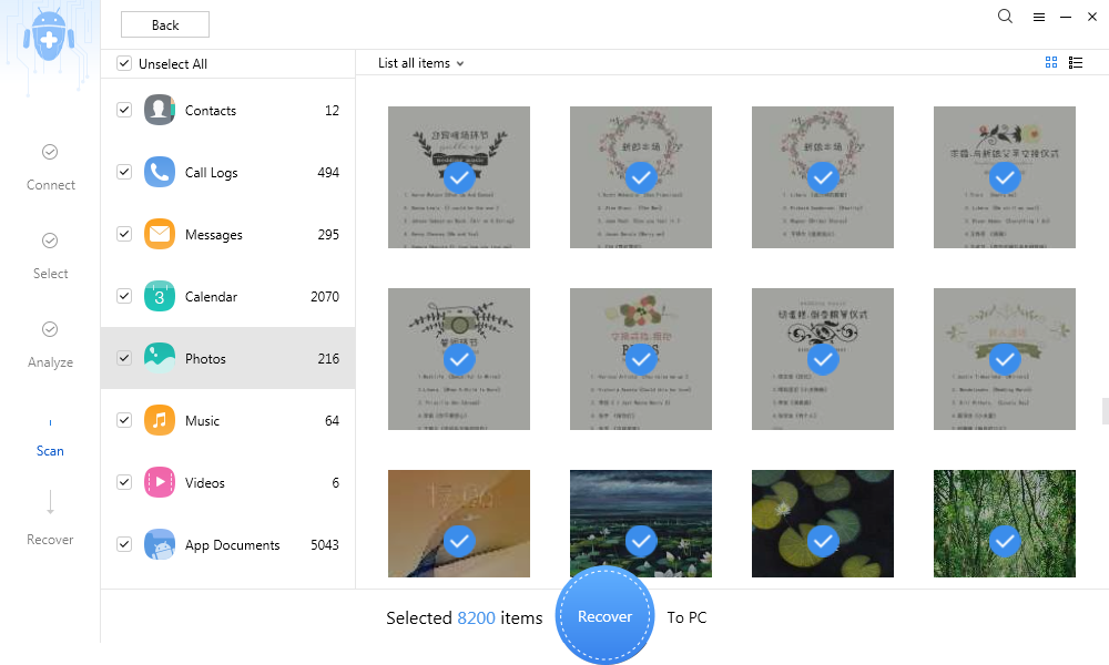 حدد ما تود إستعادته ثم اضغط على كلمة “Recover” وسيتم إستعادة جميع الملفات التي تم حذفها على حاسوبك ويمكنك نقلها لهاتفك مجددا ;)