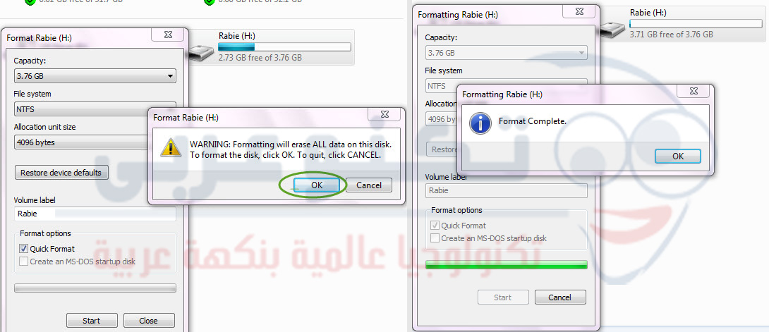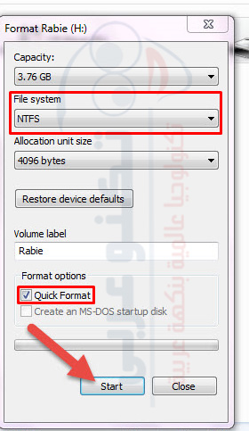 1) بعد توصيل الفلاشة قم بعمل فورمات لها عن طريق الضغط بزر الفأرة الأيمن ثم إختر الأمر “تهيئة” format وبعدها إختر نوع NTFS من File system ثم قم بالتحديد على الفورمات السريع Quick format وإضغط Start وانتظر قليلاً لحين الإنتهاء من تلك عملية الفورمات للفلاشة