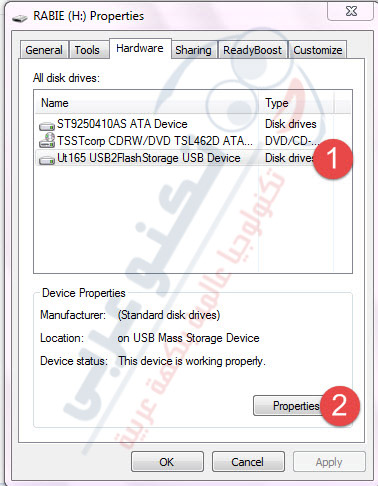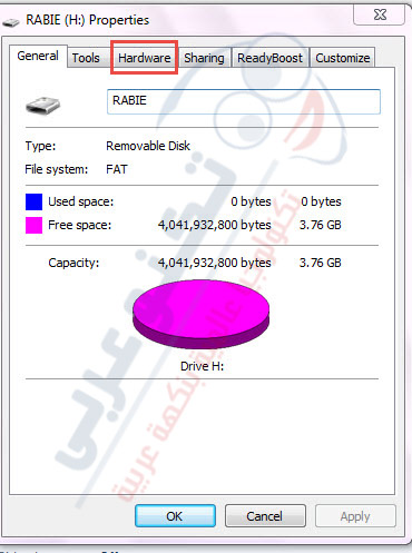 2) بعد الإنتهاء من خطوة الفورمات تقوم بالضغط على الفلاشه كليك يمين وتختار آخر إختيار فى القائمه Properties معناها خصائص وسوف تظهر لك قائمة جديدة فاختر منها كلمة Hardware