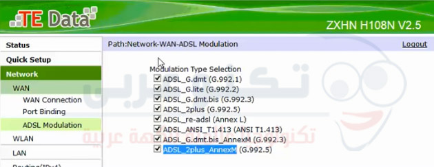من تبويب Network إختر منها ADSL modulation وتأكد جيداً من ن جميع الإختيارات مفعلة وأهمهم ADSL_2plus_annexM (G99.5) ليتم إلتقاط الشبكة المناسبة أينما توفرت.